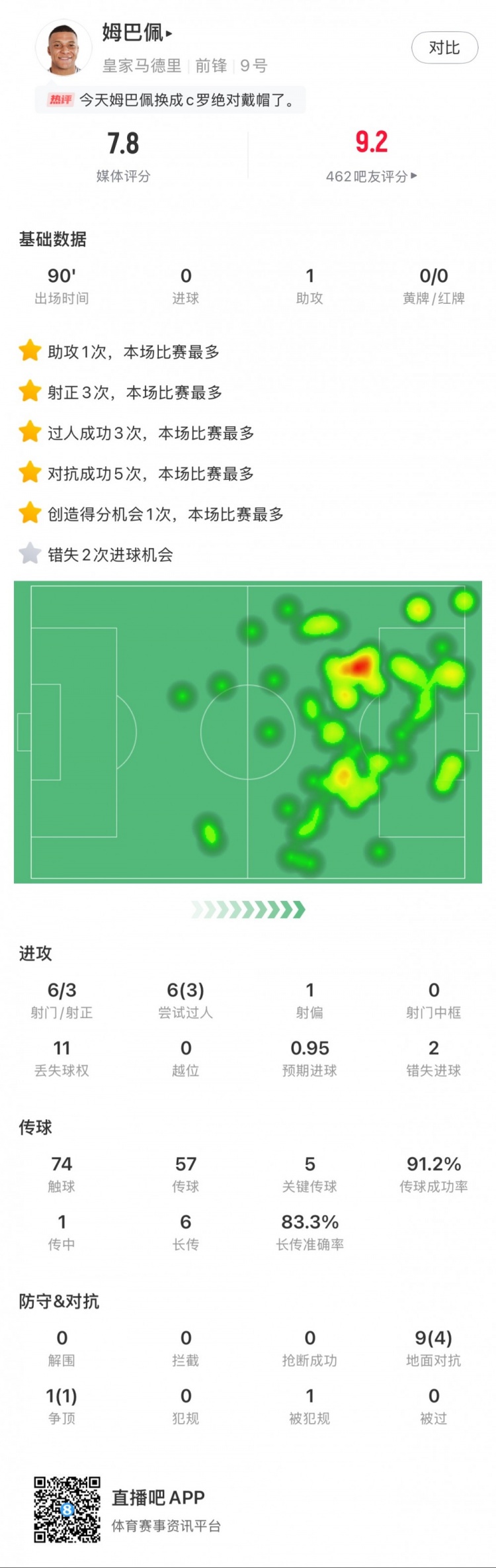 2025-02-24 16:11:32姆巴佩本場數(shù)據(jù):1次助攻,6射3正,2次錯失得分機(jī)會,3次過人
