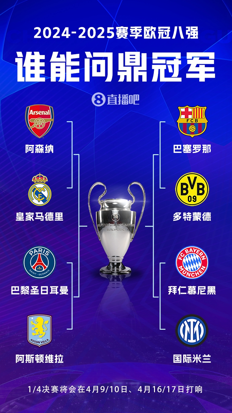 2025-03-13 14:18:45豪門(mén)之戰(zhàn)!歐冠8強(qiáng)全員五大聯(lián)賽,6隊(duì)拿過(guò)冠軍&槍手巴黎拿過(guò)亞軍