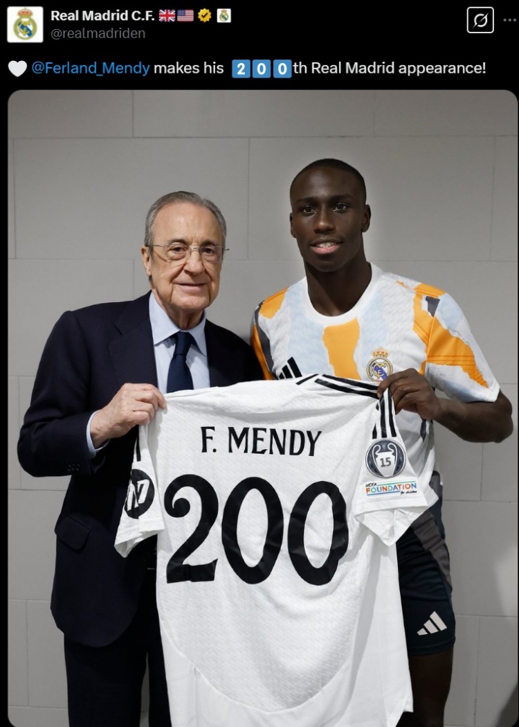 2025-03-13 14:24:38門迪達(dá)成皇馬200次出場里程碑,獲贈紀(jì)念球衣&與弗洛倫蒂諾合影