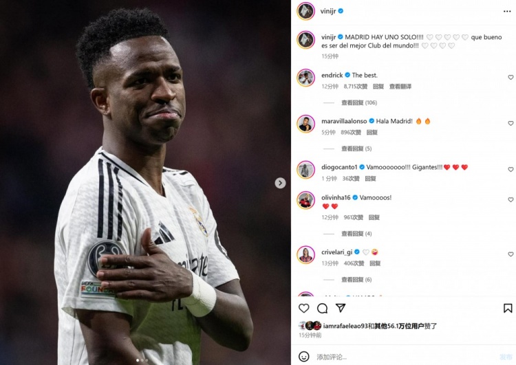 2025-03-13 14:26:33維尼修斯社媒發(fā)文:馬德里只有唯一,作為世界最佳球隊一員太棒了