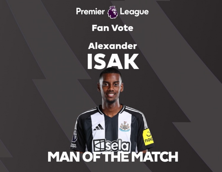 本場比賽紐卡前鋒伊薩克上半場兩分鐘連入兩球,賽后他也當(dāng)選英超官方球迷票選全場最佳球員。