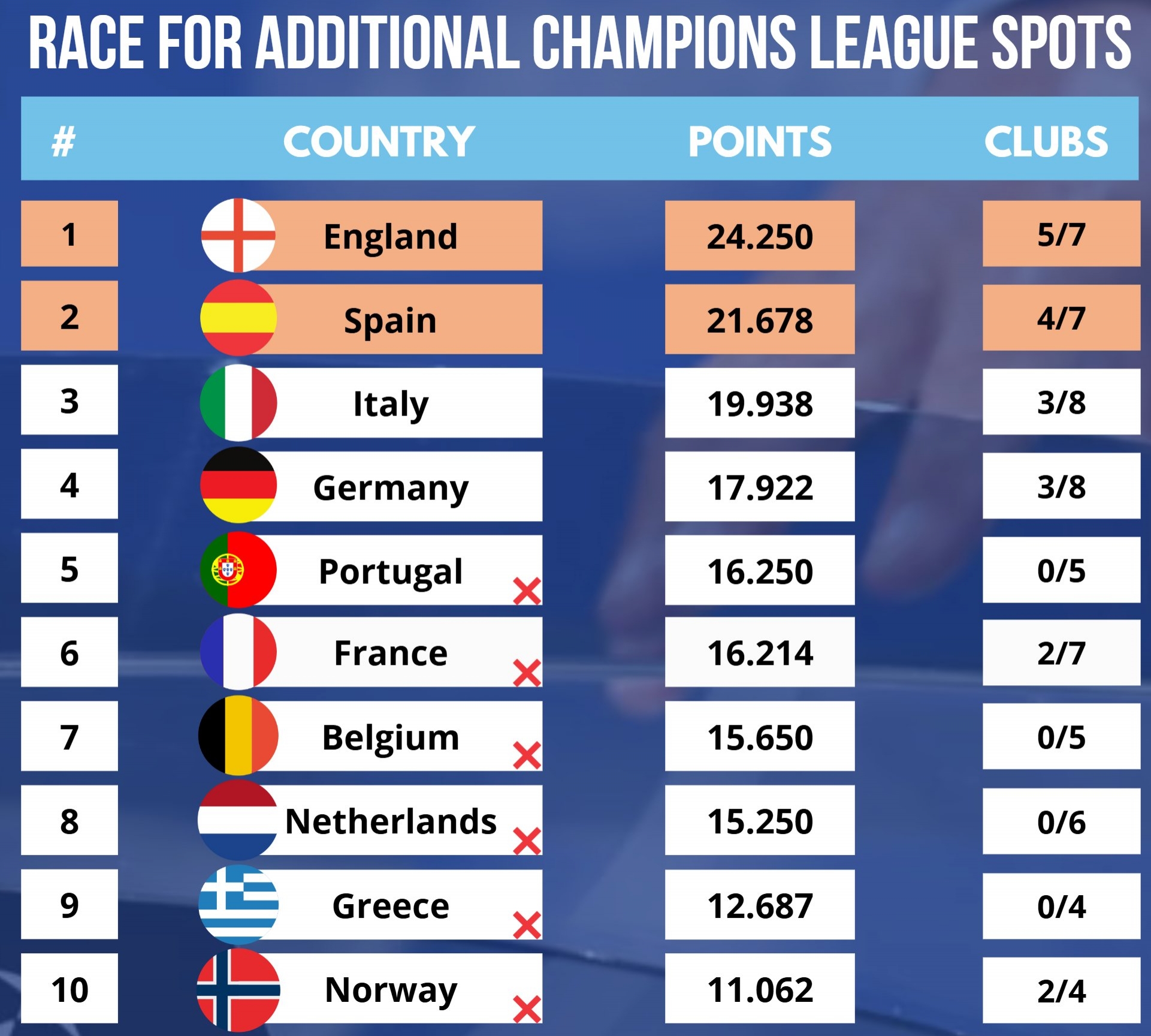 24/25賽季最新歐戰(zhàn)積分(前2名獲額外歐冠名額):