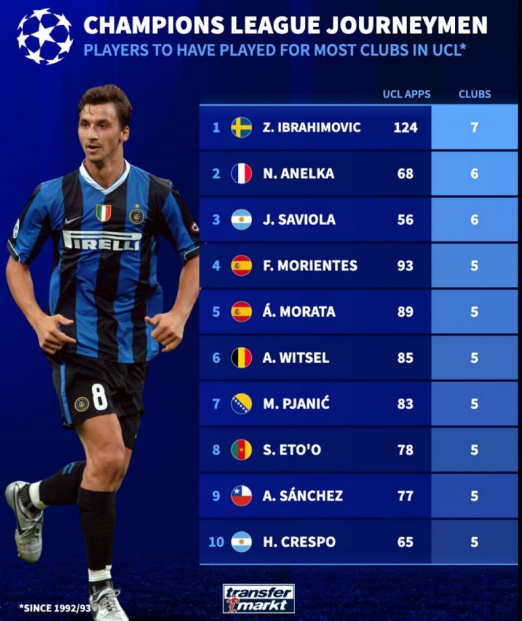 2025-03-14 11:48:18歐冠改制后代表最多球隊(duì)參賽榜:伊布7隊(duì)居首,阿內(nèi)爾卡次席