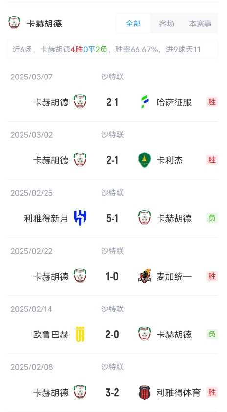 目前利雅得勝利取得了14勝6平4負(fù)的成績,積48分,暫居聯(lián)賽第4。卡赫胡德取得了9勝4平11負(fù)成績,積31分,暫居聯(lián)賽第10。