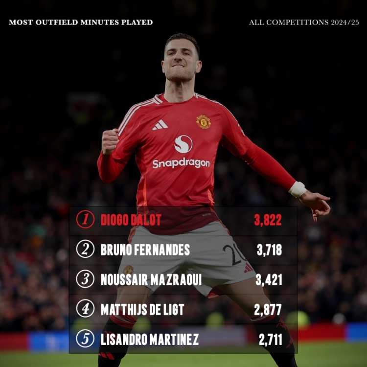 2025-03-16 06:41:51本賽季曼聯(lián)非門將出場時間榜:達洛特壓B費居首,馬茲拉維在列