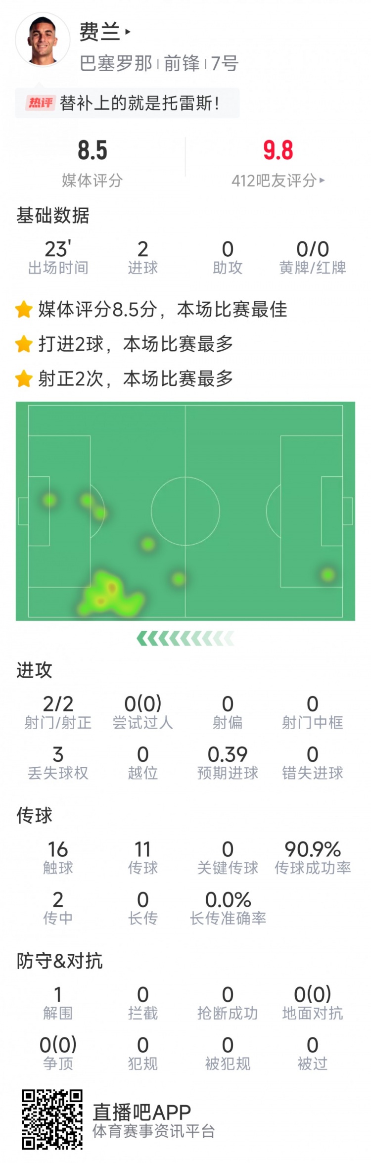 2025-03-17 07:13:59今天是托雷斯!費(fèi)蘭本場數(shù)據(jù):登場23分鐘梅開二度,僅用2次射門