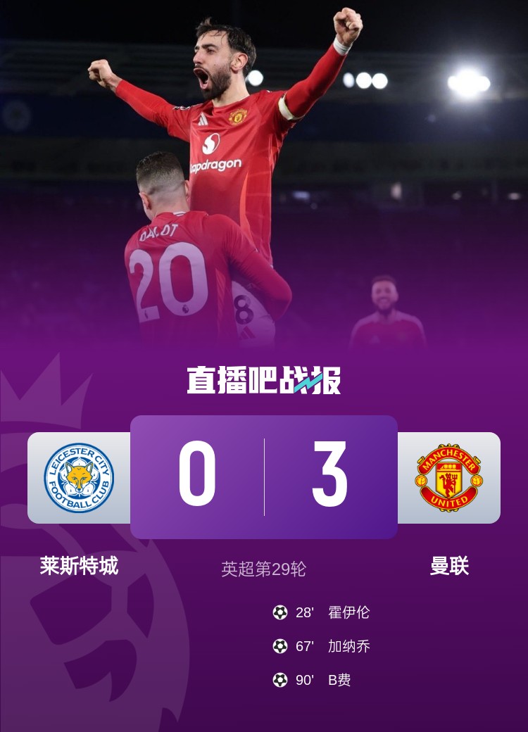 賽季4殺!曼聯(lián)3-0萊斯特 B費1射2傳霍伊倫加納喬破門海文傷退
