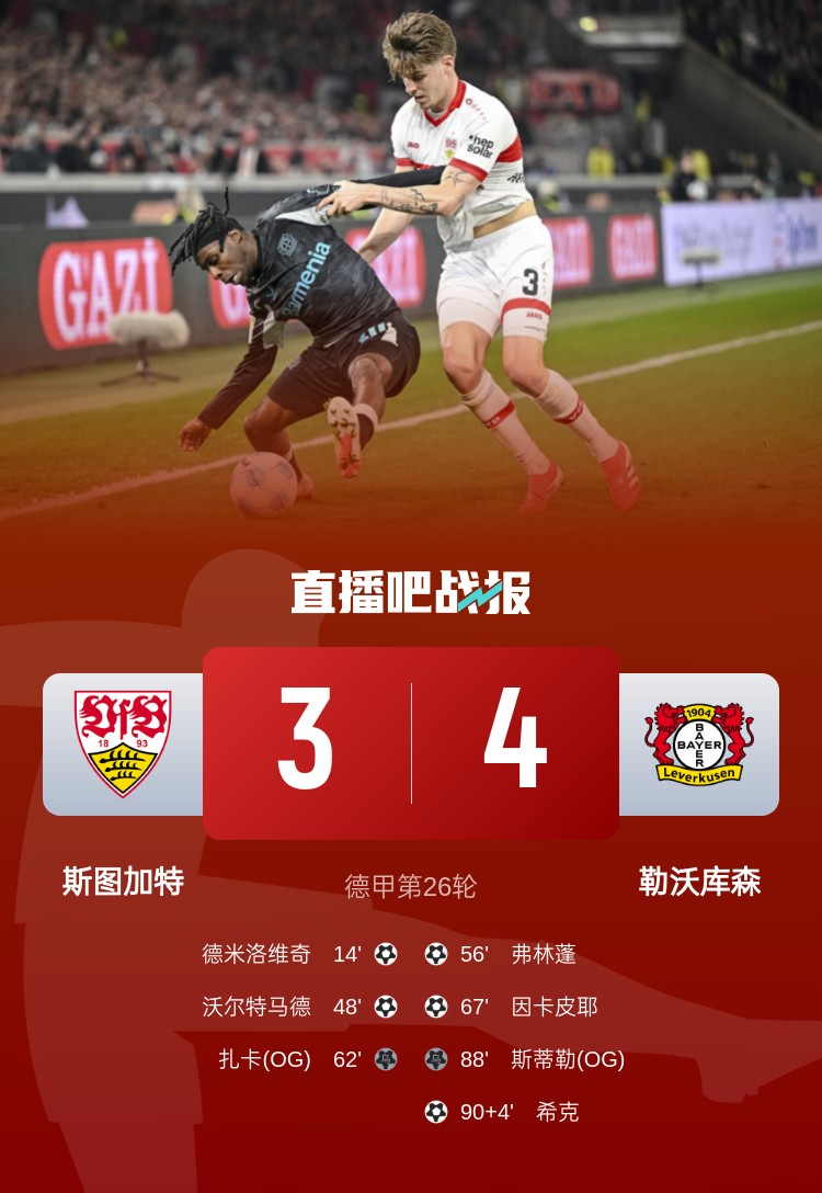 希克補時頭球絕殺,勒沃庫森4-3逆轉(zhuǎn)斯圖加特。積分榜方面,勒沃庫森落后拜仁6分。