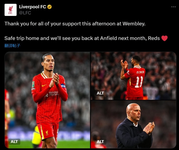 利物浦官推也在賽后感謝了球迷:“感謝你們今天下午在溫布利的支持。安全回家。紅軍們,我們下個(gè)月安菲爾德再見(jiàn)。”