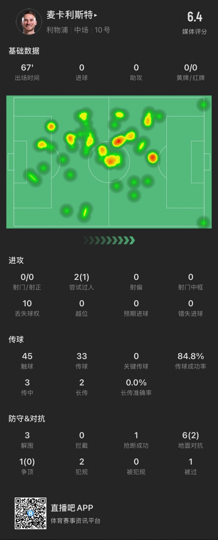 2025-03-17 07:19:42麥卡本場(chǎng):7次對(duì)抗成功2次,貢獻(xiàn)3解圍1搶斷,2犯規(guī),僅獲評(píng)6.4分