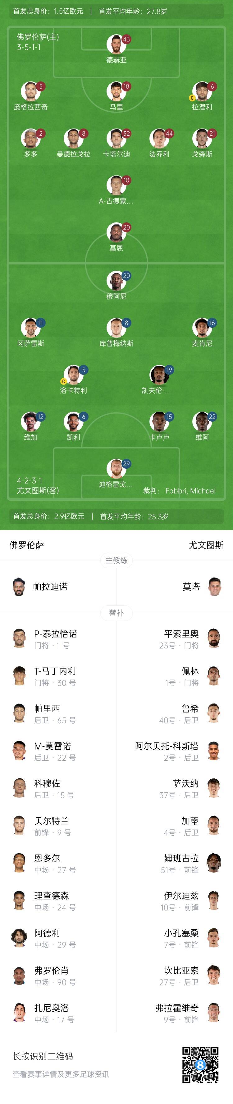 佛羅倫薩首發(fā):43-德赫亞、2-多多、5-龐格拉契奇、6-盧卡-拉涅利、18-馬里、21-戈森斯、8-曼德拉戈拉、32-卡塔爾迪、44-法喬利、10-古德蒙德森、20-莫伊塞-基恩
