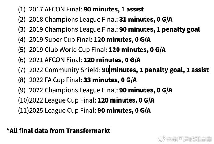 2025-03-17 16:15:26薩拉赫至今代表俱樂部和國家隊(duì)參加11場(chǎng)決賽,從未打入非點(diǎn)球進(jìn)球
