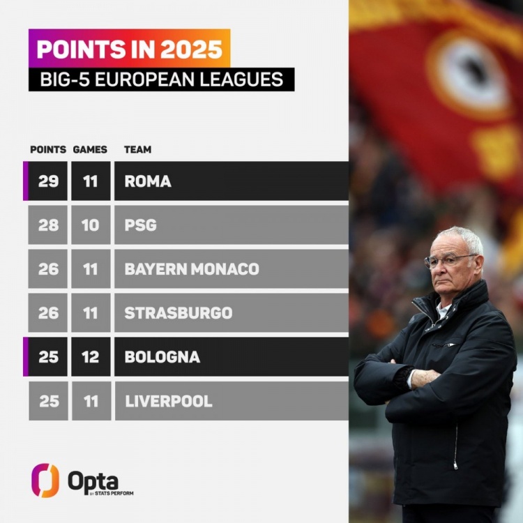 2025-03-18 08:22:30補天!2025五大聯(lián)賽拿分榜:羅馬壓巴黎居首,拜仁、利物浦在列