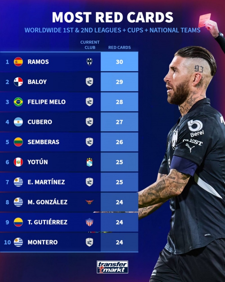 2025-03-18 21:09:27拉莫斯本輪聯(lián)賽踢人染紅,職業(yè)生涯至今吃到30張紅牌球員中最多