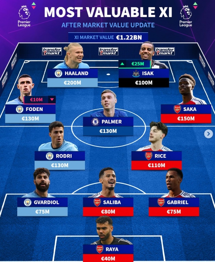 2025-03-19 07:27:12德轉(zhuǎn)列英超最貴陣:阿森納5人、曼城4將,帕爾默、伊薩克在列