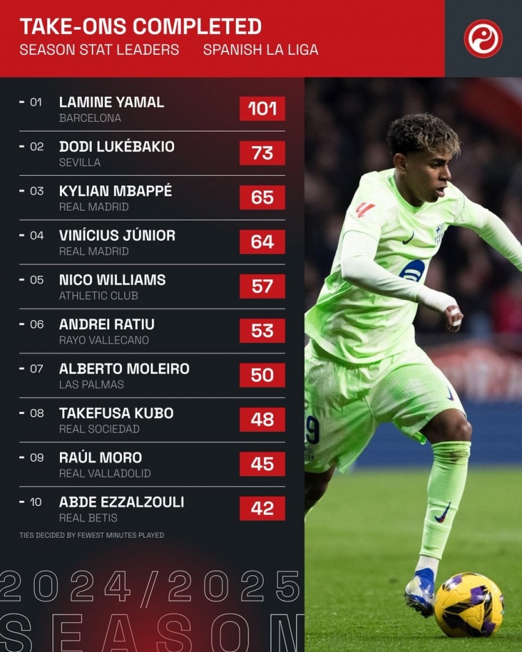 2025-03-19 07:27:26本賽季西甲成功過人榜:亞馬爾斷崖領(lǐng)跑,姆巴佩、維尼修斯在列