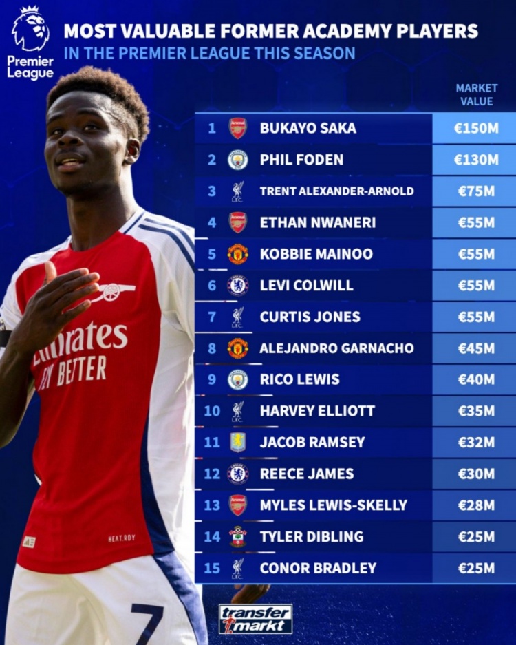 2025-03-20 23:12:43本賽季英超出自球隊(duì)青訓(xùn)球員身價(jià)榜:薩卡居首,福登&阿諾德在列