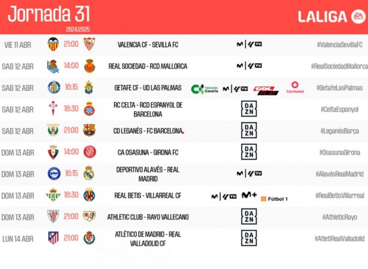2025-03-20 23:14:05西甲31輪時(shí)間:4月13日3點(diǎn)萊加內(nèi)斯vs巴薩,22:15阿拉維斯vs皇馬