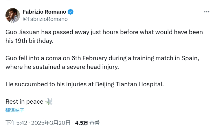 03月20日訊 18歲的國安青訓小將郭嘉璇昨日去世, 羅馬諾在社媒發(fā)文表示哀悼。