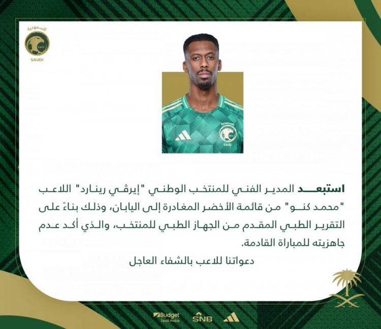 2025-03-21 08:58:12官方:穆罕默德-卡努因傷退出沙特隊(duì)本期名單