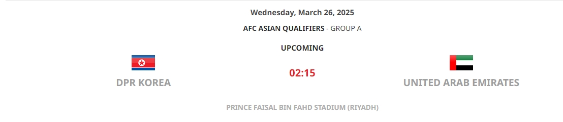 2025-03-22 10:03:21亞足聯(lián)官網(wǎng)顯示:朝鮮主場對陣阿聯(lián)酋,將在沙特利雅得進行