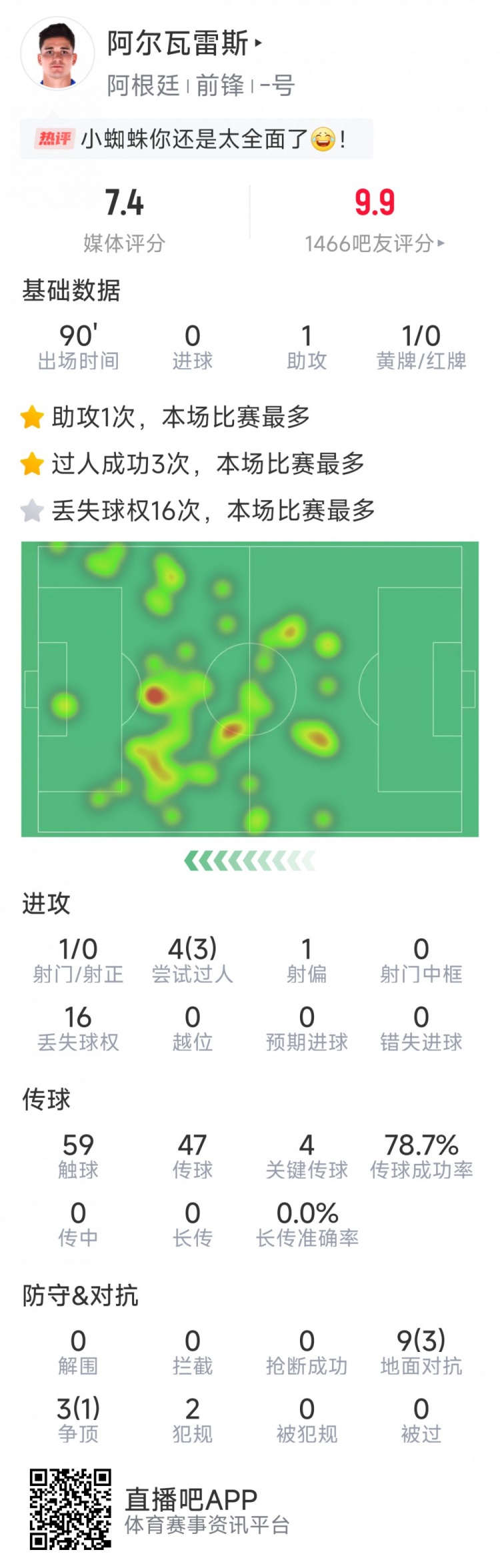 2025-03-22 10:03:30阿爾瓦雷斯本場數(shù)據(jù):1次助攻,4次關(guān)鍵傳球,3次成功過人