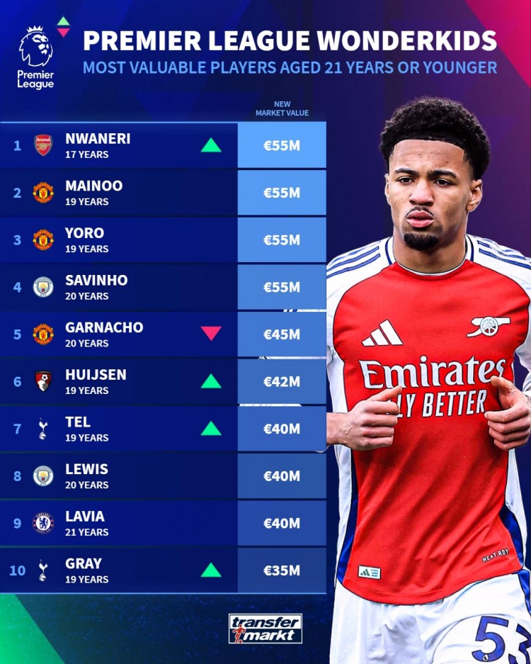 2025-03-23 17:37:17英超U21身價榜:恩瓦內(nèi)里、梅努、約羅、薩維尼奧5500萬歐居首