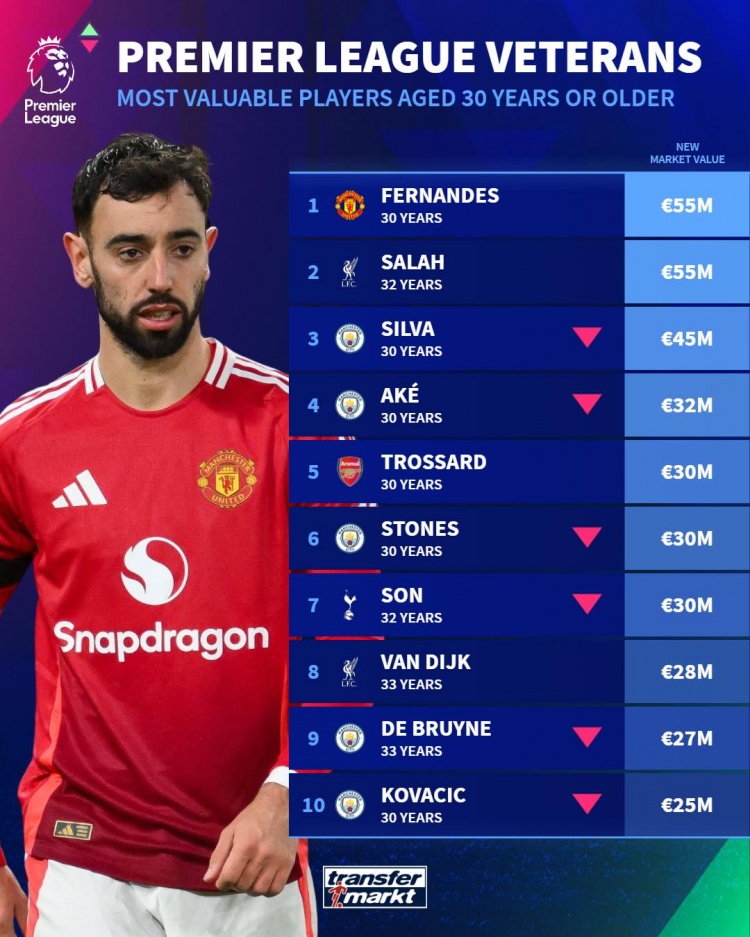 2025-03-23 17:38:32英超年齡30+球員身價榜:B費(fèi)、薩拉赫5500萬歐居首,B席第三