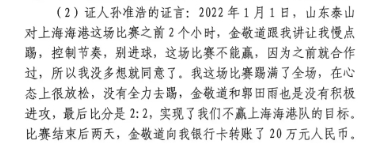 證言中,孫準(zhǔn)浩表示在泰山2-2平海港之前,金敬道說讓慢點(diǎn)踢這場(chǎng)不能贏。賽后,金敬道給孫準(zhǔn)浩20萬人民幣;在2-0河北之前,孫準(zhǔn)浩跟著金敬道下注50萬,這場(chǎng)比賽結(jié)束后金敬道把錢給金敬道姐姐郭今蘭,郭今蘭再給孫準(zhǔn)浩的哥哥。