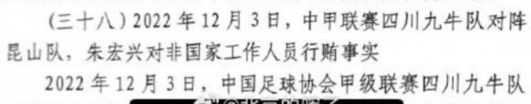 2022年12月3日,中甲聯(lián)賽四川九牛隊(duì)對(duì)陣?yán)ド疥?duì),朱宏興對(duì)非國(guó)家工作人員行賄事實(shí)。