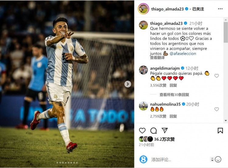 2025-03-23 17:46:01阿爾馬達(dá)社媒慶祝進(jìn)球,迪馬利亞留言:隨時(shí)轟一腳吧!