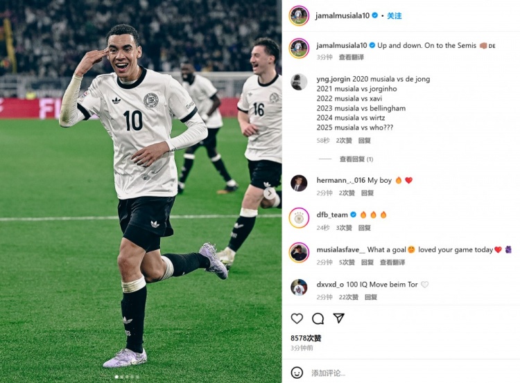2025-03-24 09:24:43角球偷襲得手!穆西亞拉社媒曬照:有起有伏,晉級歐國聯(lián)四強(qiáng)!