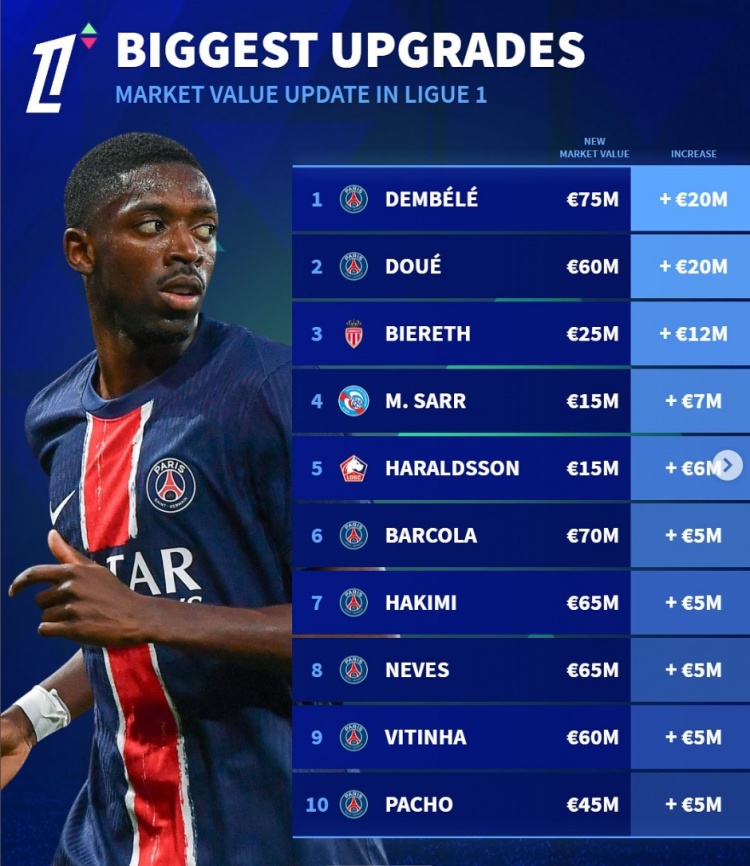 2025-03-25 01:51:08法甲身價更新升值榜:登貝萊&杜埃均上漲2000萬歐,比雷斯在列