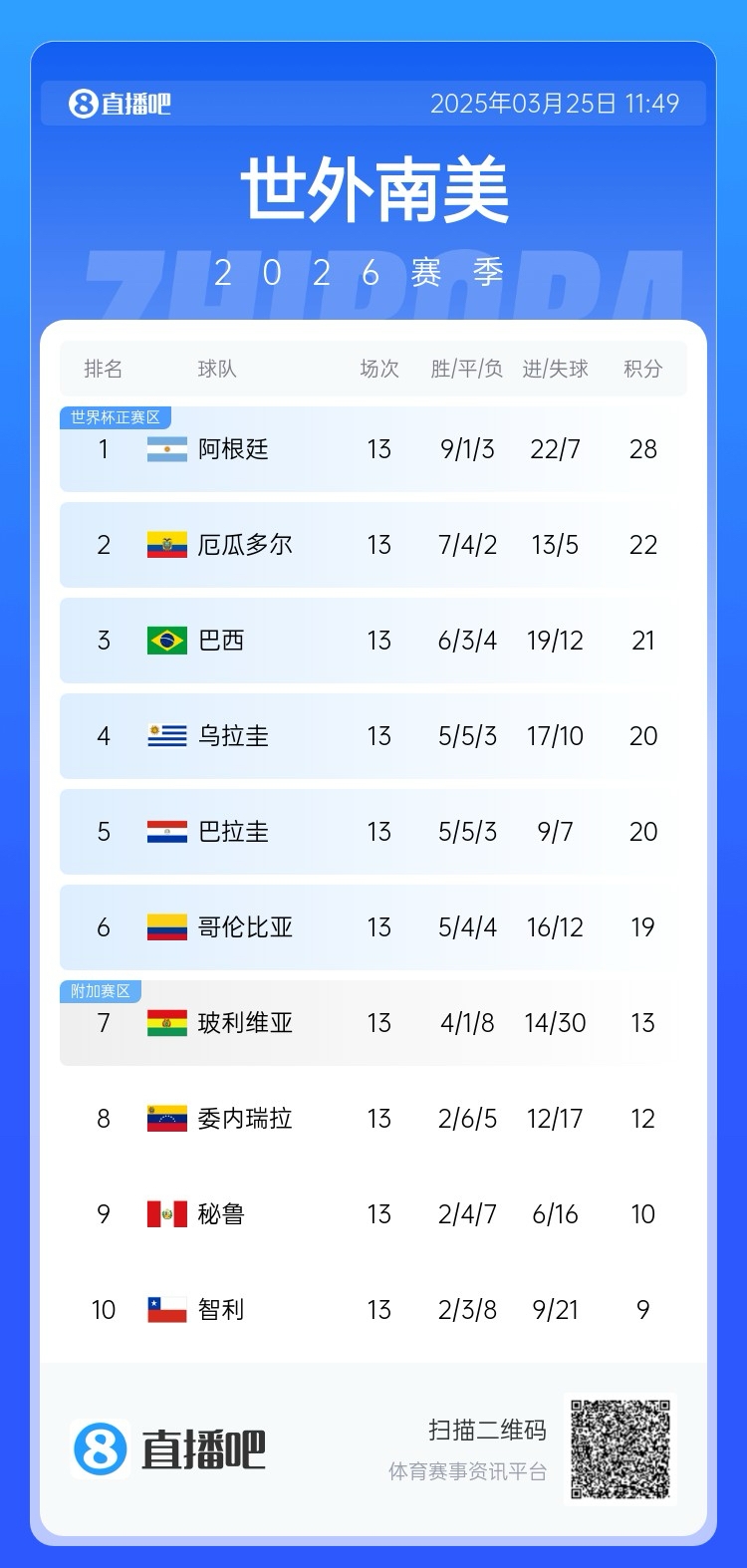 世預(yù)賽南美區(qū)已賽13輪、還剩5輪,前6可直通2026世界杯。目前阿根廷28分領(lǐng)跑,領(lǐng)先第7玻利維亞15分。