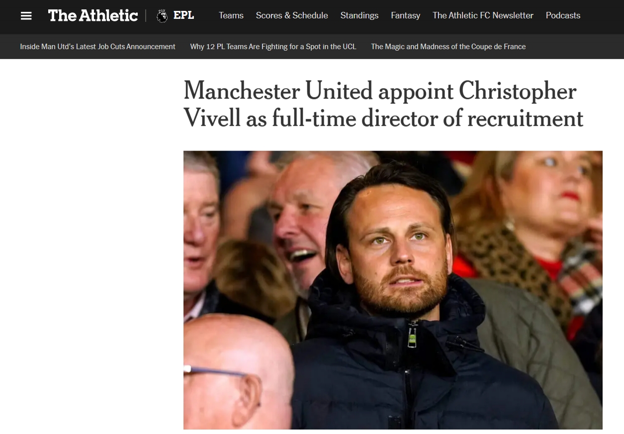 2月25日訊 據(jù)《Theathletic》報道,曼聯(lián)任命克里斯托弗-維維爾(Christopher Vivell)為全職招聘總監(jiān),此前他曾臨時擔(dān)任該職位。