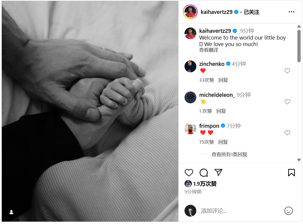 2025-03-26 20:24:36喜得貴子!哈弗茨社媒宣布當?shù)簹g迎來到這個世界,我們愛你