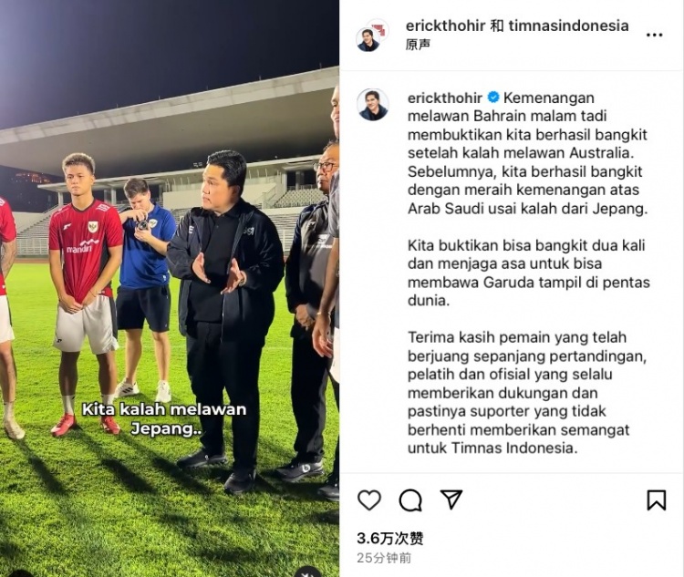 印尼足協(xié)主席托希爾在發(fā)社媒,這次他曬出了賽后他召集球員進行訓話的Vlog,視頻中托希爾說道:“此前我們在0-4慘敗日本隊后,回到主場我們2-0擊敗沙特隊;今天的情況類似,上輪我們慘敗后今天我們又擊敗了巴林隊。我希望你們接下來能繼續(xù)全力以赴。另外,我相信我們還在計劃當中:我們依舊保留通往世界杯的希望。”