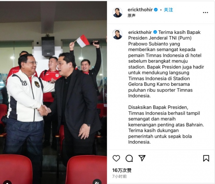 賽后印尼足協(xié)主席托希爾更新社媒,曬出了印尼總統(tǒng)蘇比延多親臨現(xiàn)場(chǎng)觀戰(zhàn)的Vlog,并配文寫道: