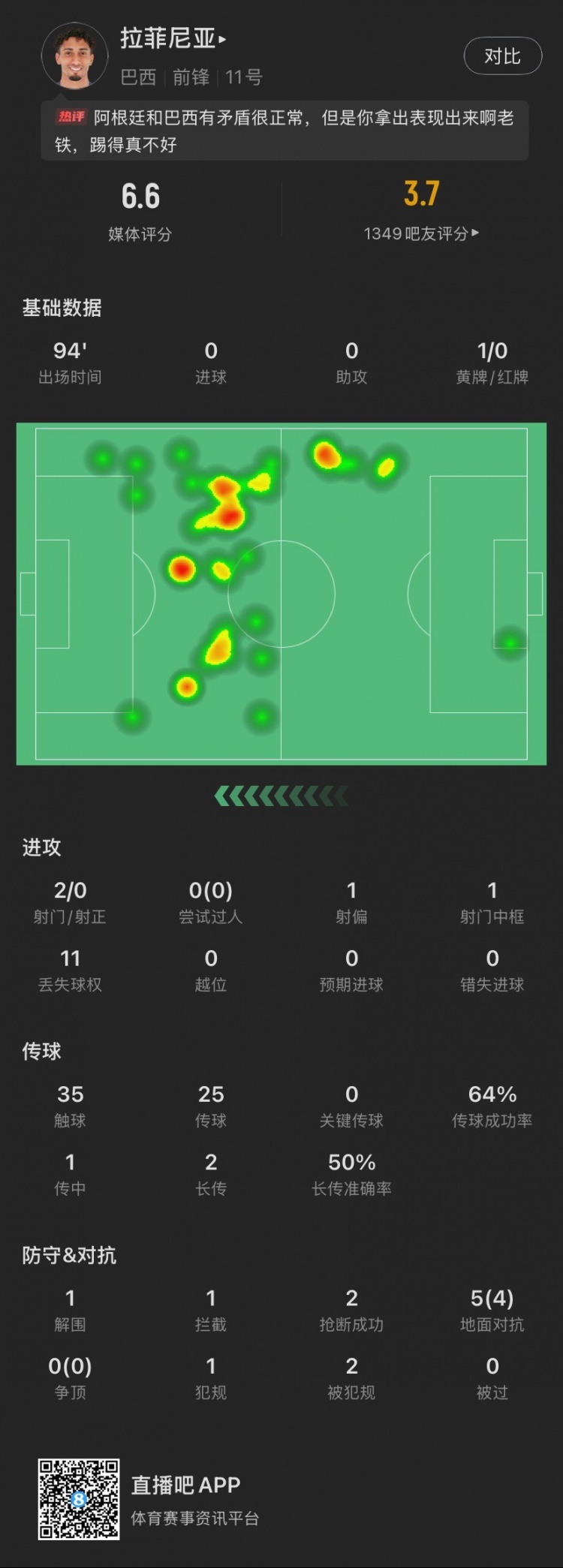 2025-03-26 20:41:09白放狠話了?拉菲尼亞本場:2射0正1中框,1黃牌,5次對抗成功4次