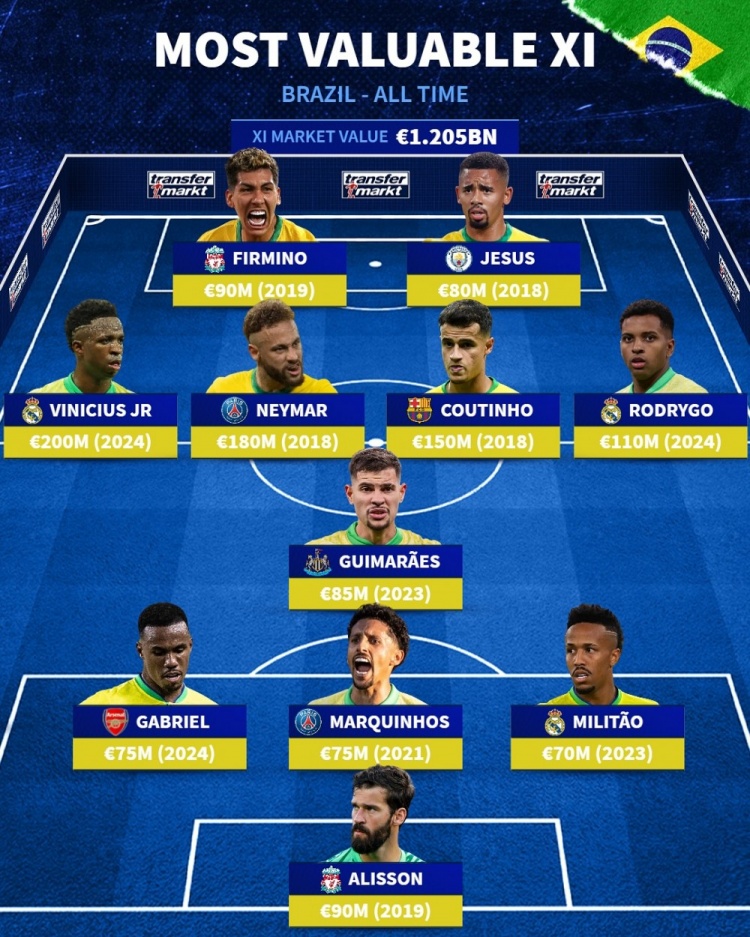 2025-03-26 20:46:58巴西歷史德轉(zhuǎn)身價(jià)最高陣:內(nèi)馬爾、維尼修斯在列,總價(jià)12億歐