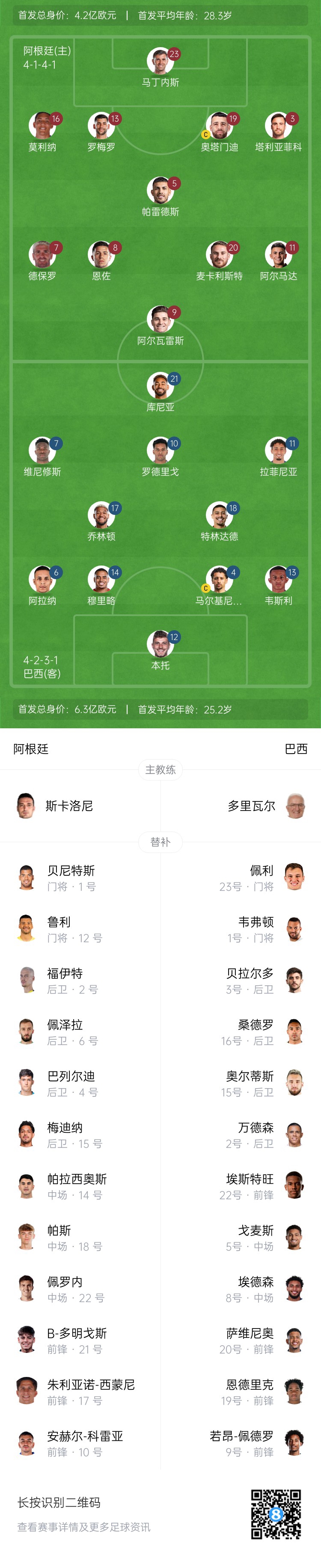 阿根廷首發(fā):23-馬丁內(nèi)斯、16-莫利納、13-羅梅羅、19-奧塔門迪、3-塔利亞菲科、7-德保羅、5-帕雷德斯、20-麥卡利斯特、8-恩佐、11-阿爾馬達、9-阿爾瓦雷斯