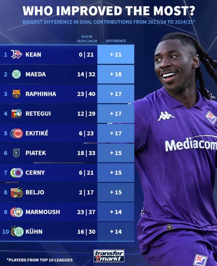 2月26日訊 《轉(zhuǎn)會(huì)市場(chǎng)》統(tǒng)計(jì)了歐洲前十聯(lián)賽球員相比上賽季的直接參與進(jìn)球提升情況,小基恩居首。