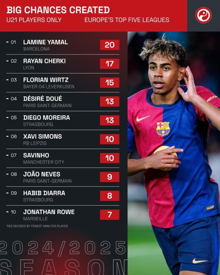 3月27日訊 《Squawka》統(tǒng)計(jì)出了本賽季創(chuàng)造重大機(jī)會(huì)最多的五大聯(lián)賽U21球員top10,亞馬爾以20次居首,至于運(yùn)動(dòng)戰(zhàn)創(chuàng)造機(jī)會(huì)方面,維爾茨和亞馬爾則以46次并列榜首。