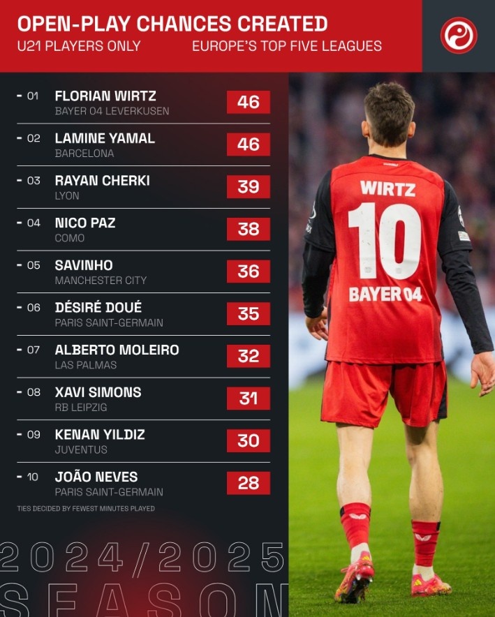 2025-03-27 08:46:05五大聯(lián)賽U21運(yùn)動(dòng)戰(zhàn)創(chuàng)造機(jī)會(huì)排行:亞馬爾、維爾茨46次并列榜首