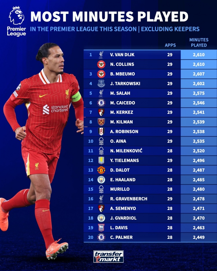2025-03-27 08:46:08英超外場球員出場榜:范迪克打滿29場居首,薩拉赫第5、凱塞多第6