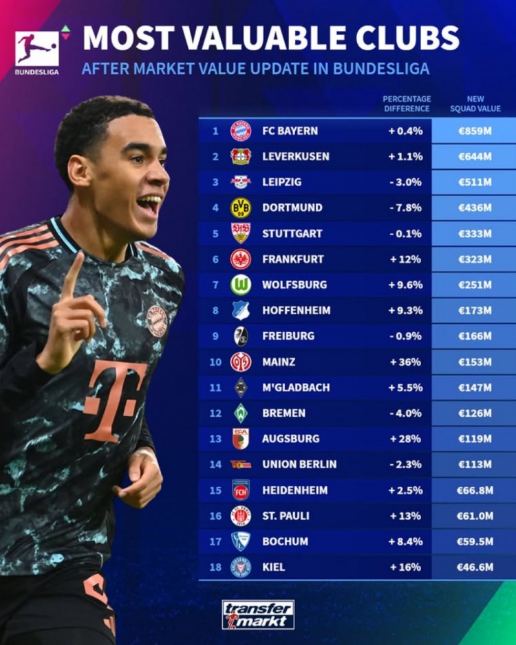 德甲球隊德轉(zhuǎn)身價排名(括號內(nèi)為更新后身價變化幅度):