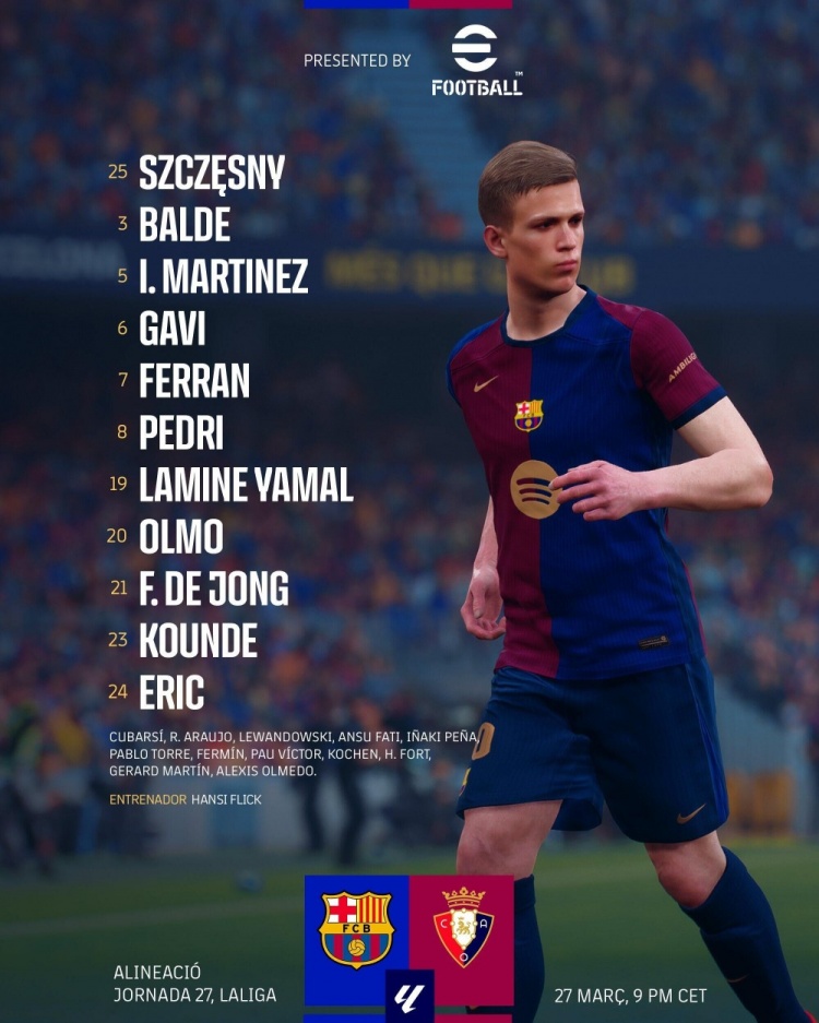 巴薩首發(fā):25-什琴斯尼、23-孔德、24-加西亞、5-伊尼戈、3-巴爾德、8-佩德里、21-德容、6-加維、19-亞馬爾、7-費(fèi)蘭、20-奧爾莫