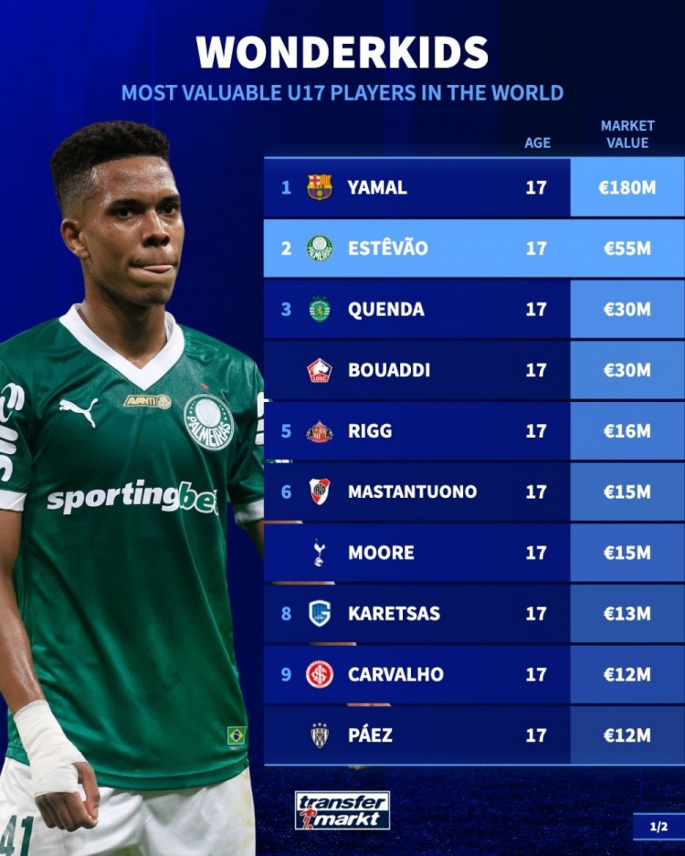 2025-03-29 09:49:59德轉(zhuǎn)U17身價榜:亞馬爾1.8億斷崖領(lǐng)跑,切爾西預(yù)訂埃斯特旺等多人