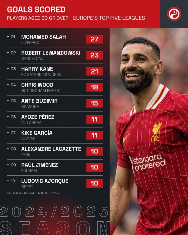 2025-03-29 09:51:25本賽季五大聯(lián)賽僅3名30+球員打進(jìn)20+聯(lián)賽進(jìn)球:薩拉赫、萊萬(wàn)、凱恩