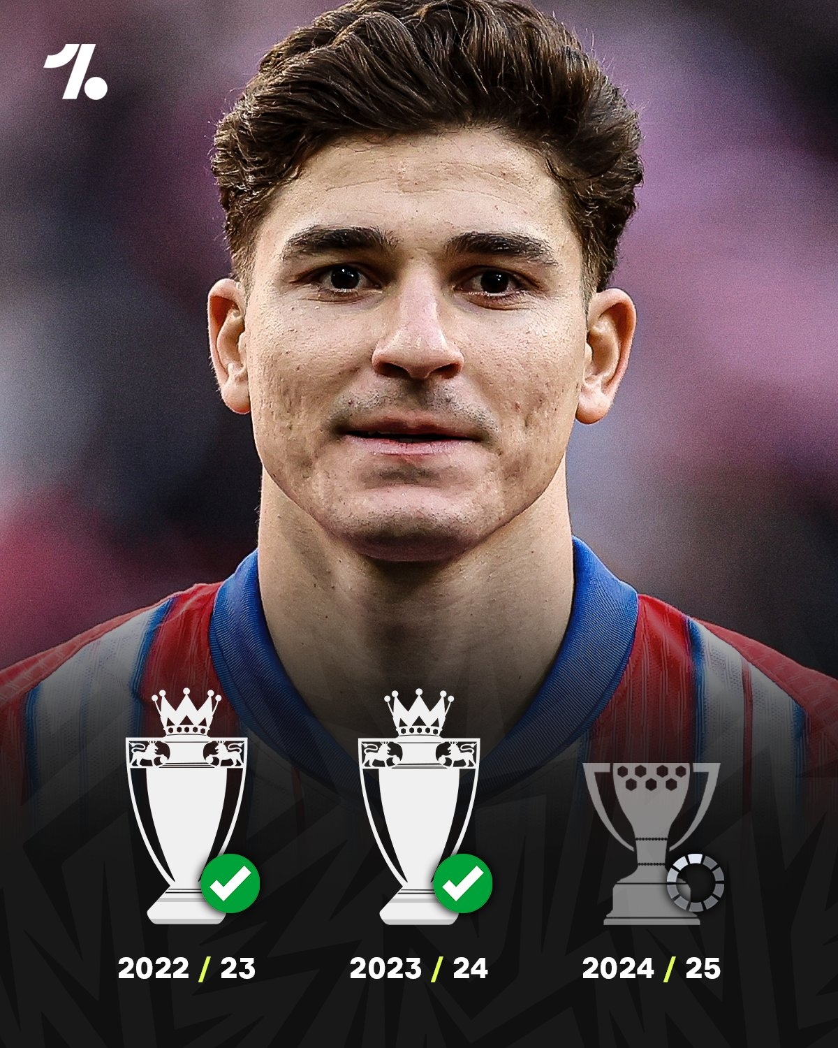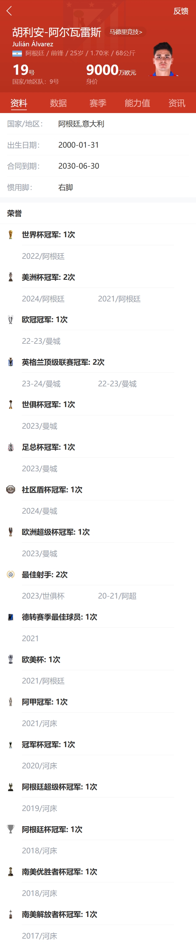 在本賽季之前,阿爾瓦雷斯已經(jīng)連續(xù)三個賽季斬獲聯(lián)賽冠軍。2021賽季,阿爾瓦雷斯隨河床奪得阿根廷職業(yè)聯(lián)賽冠軍,2022-23和2023-24賽季,阿爾瓦雷斯則隨曼城奪得兩座英超冠軍。